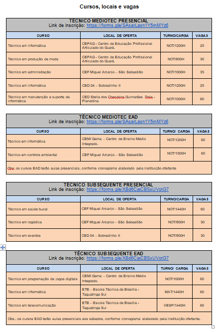 Em relação aos cursos subsequentes, previstos para os demais interessados, as oportunidades são de técnico em saúde bucal; logística; eventos; programação de jogos digitais; informática e telecomunicação, em um total de 300 vagas.