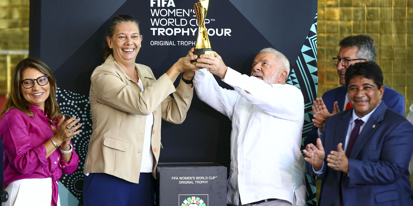 Brasília (DF), 30/03/2023 – Taça da Copa do Mundo de Futebol Feminino de 2023 é apresentada ao presidente Luiz Inácio Lula da Silva e à ministra do Esporte, Ana Moser, pela FIFA e pela CBF.