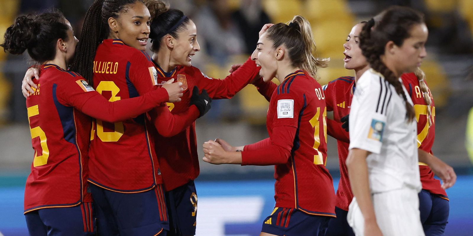 As espanholas sobraram no primeiro tempo contra as costarriquenhas no estádio Dunedin, na Nova Zelândia, e ainda contaram com a sorte do gol contra, aos 21 minutos, de Valeria del Campo. Depois, em apenas seis minutos, a Espanha balançou a rede duas vezes: Aitana Bonmati e Esther González. A vantagem espanhola poderia ser ainda maior, com um pênalti a favor da Espanha aos 30 minutos, mas a goleira Solera evitou a goleada ao defender a cobrança da jogadora Hermoso.