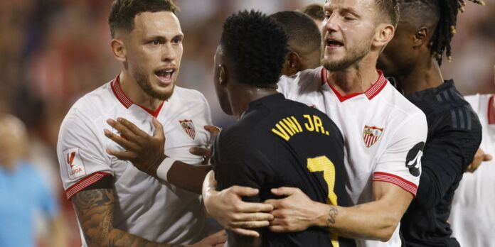O Sevilla informou que identificou e expulsou do Estádio Ramón Sánchez Pizjuán um torcedor que cometeu agressões xenófobas e racistas, na tarde deste sábado (21), durante o empate por 1 a 1 com o Real Madrid pela 10ª rodada do Campeonato Espanhol. Os atos foram realizados justamente no momento no qual o atacante brasileiro Vinícius Júnior estava reclamando com jogadores da equipe da casa.