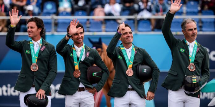 A equipe brasileira de hipismo conquistou a medalha de bronze na disputa por equipes de saltos nos Jogos Pan-Americanos de 2023, disputados em Santiago (Chile). O feito foi alcançado nesta quarta-feira (1), na Escola de Equitação do Exército do Chile, na cidade de Quillota, por Rodrigo Pessoa, Marlon Zanotelli, Pedro Veniss e Stephan Barcha. O ouro ficou com os Estados Unidos e o Canadá com a prata.