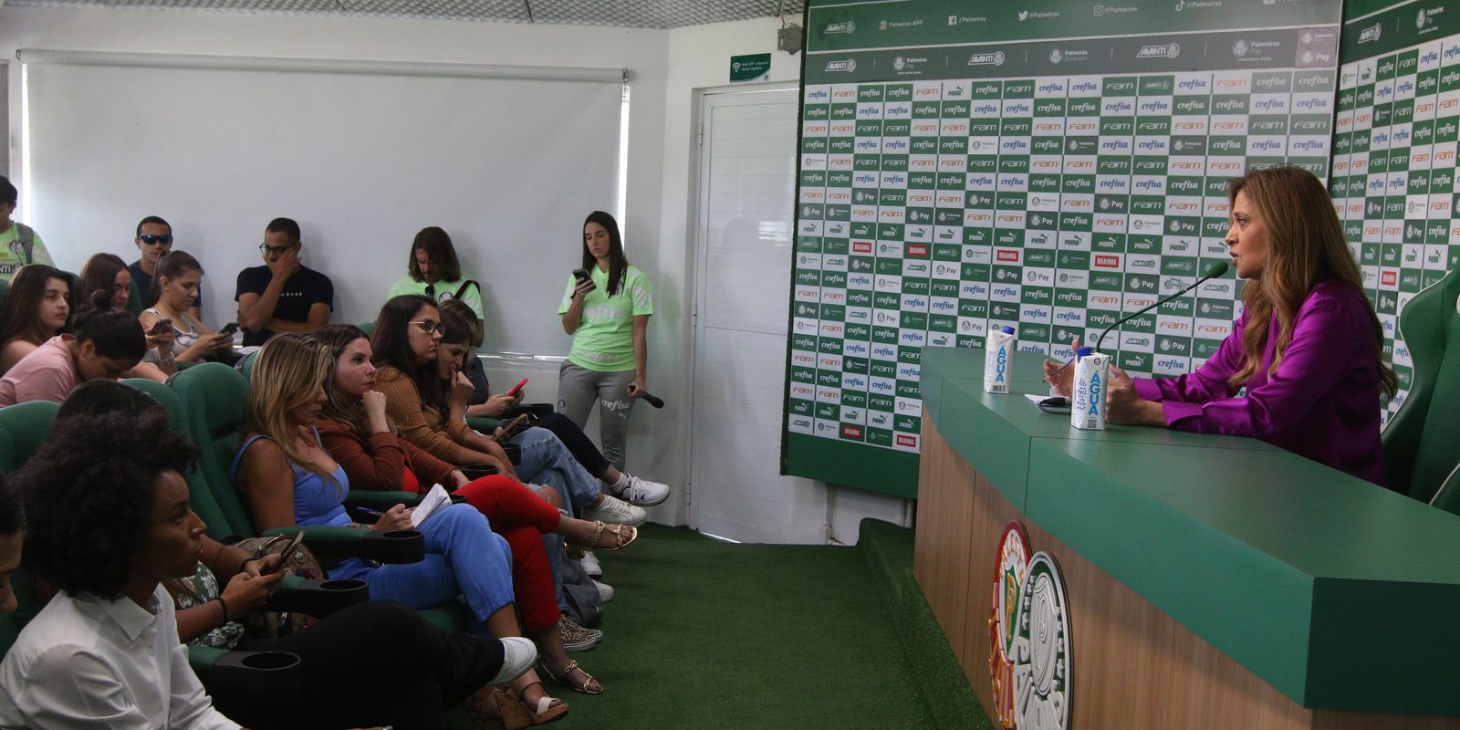 “Boa tarde a todas.” Foi assim que a presidente do Palmeiras, Leila Pereira, se dirigiu nesta terça-feira (16) à plateia de jornalistas, na primeira entrevista coletiva do ano da dirigente, convocada apenas para mulheres. A iniciativa causou polêmica, entre críticas e elogios de jornalistas. Emissoras e jornais não cumpriram a contento a convocatória: cinegrafistas e fotógrafos ainda eram maioria. As repórteres, por outro lado, lotaram as cadeiras e ouviram, em primeira mão, que o clube renovou com o técnico Abel Ferreira até 2025.