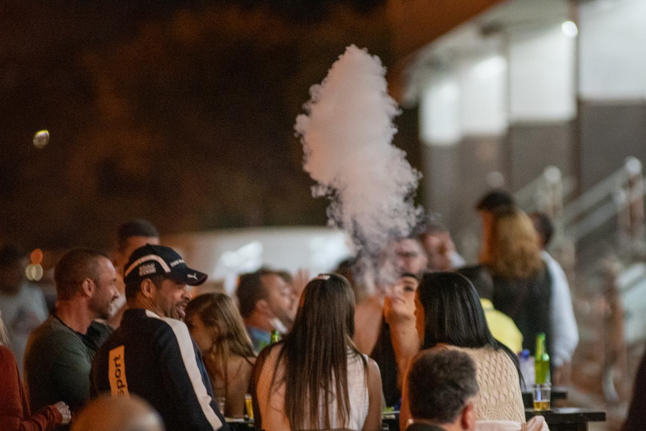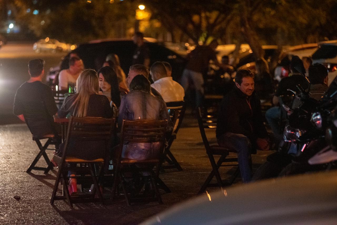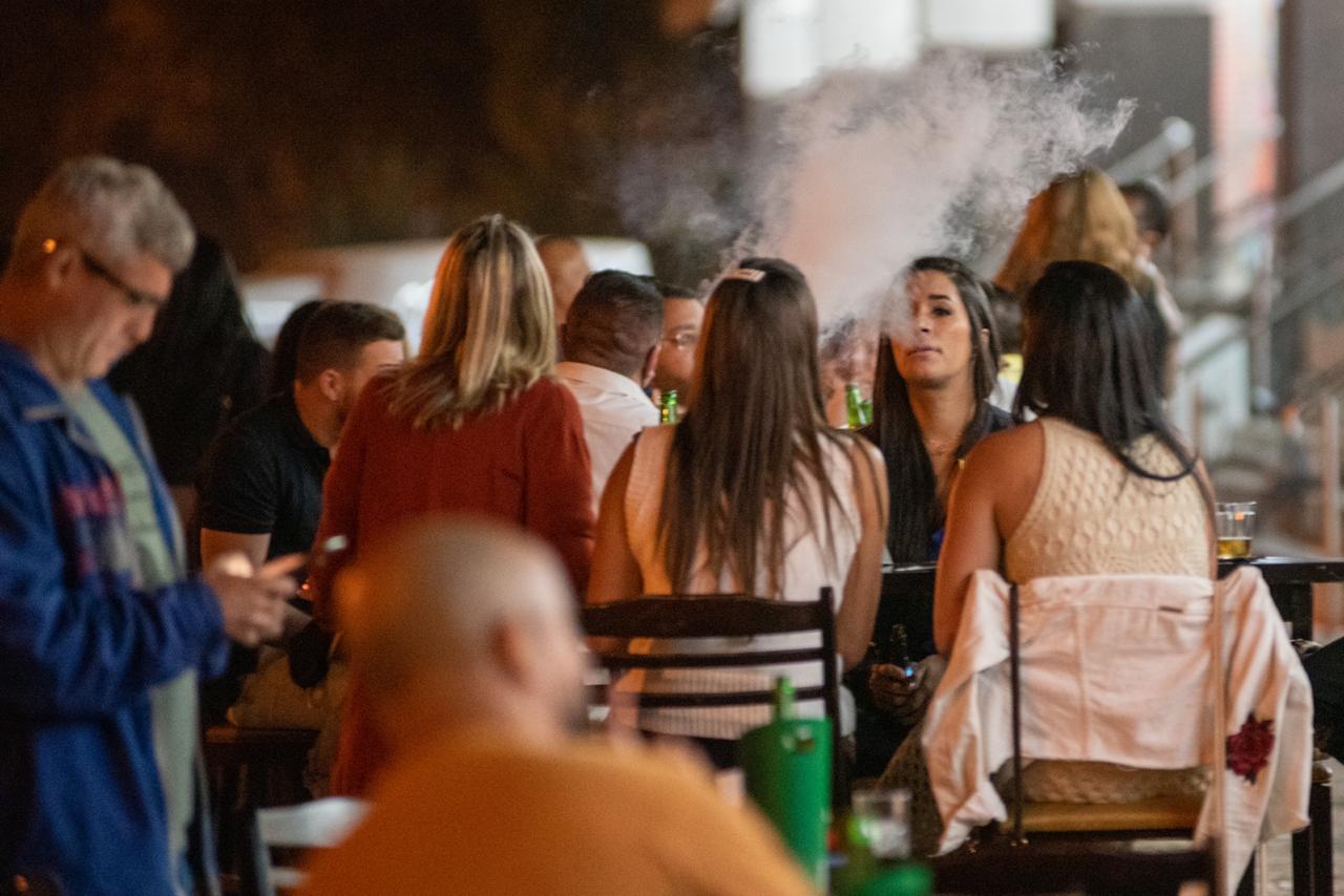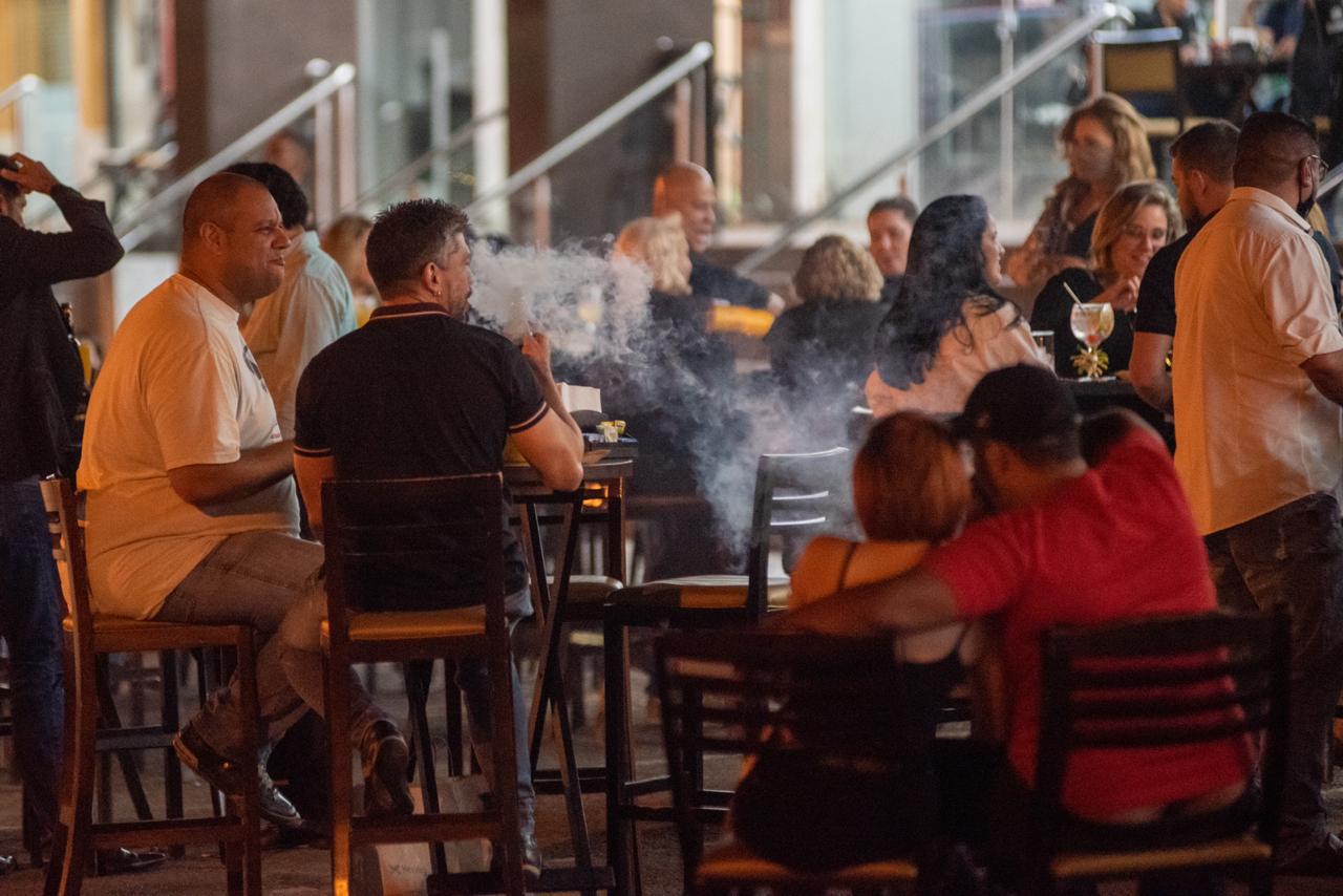 Aglomerados, excedendo o limite de pessoas por mesa e desrespeitando o uso obrigatório da máscara de proteção, clientes comemoravam a reabertura do local em clima de festa e música alta.