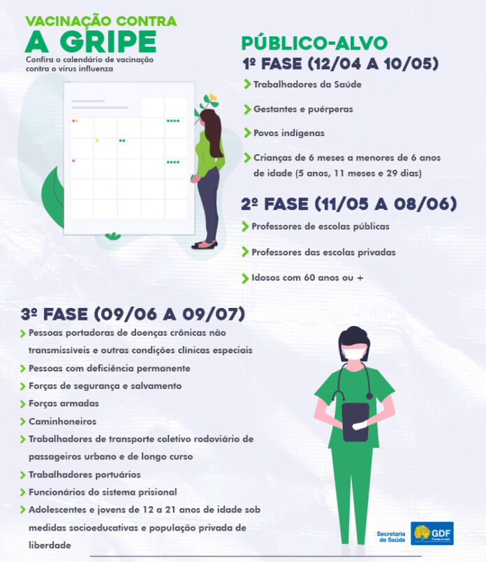 Iniciada na última segunda-feira (12), a 23ª Campanha Nacional de Vacinação contra Influenza prevê vacinar, em três etapas, os integrantes dos grupos prioritários. São cem unidades básicas de saúde (UBSs) abertas de segunda a sexta-feira para receber o primeiro grupo.