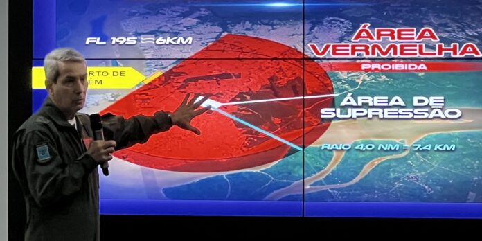 Na área de supressão, a um raio de 2 km, do Hangar Centro de Convenções, poderão ingressar apenas aeronaves cumprindo missões de apoio à vida humana mediante estrita autorização da Autoridade de Defesa Aeroespacial.