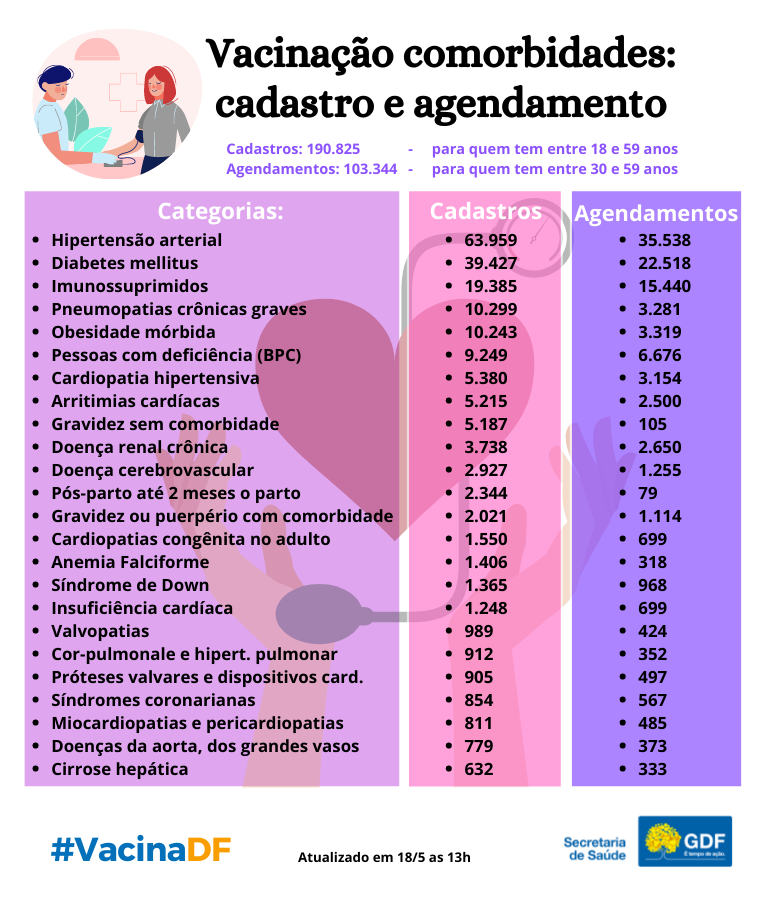 Veja a lista das comorbidades e o balanço atual de agendamentos e cadastramentos: