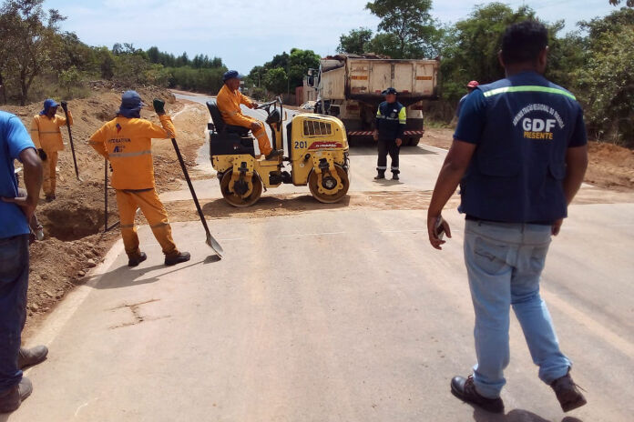 Equipes do Polo Leste do GDF Presente, que abrange a região, trabalharam na preparação da pista de terra, antes de iniciar a pavimentação, com serviços de terraplanagem e nivelação. Os profissionais auxiliam também na execução da primeira de três ondulações na via.