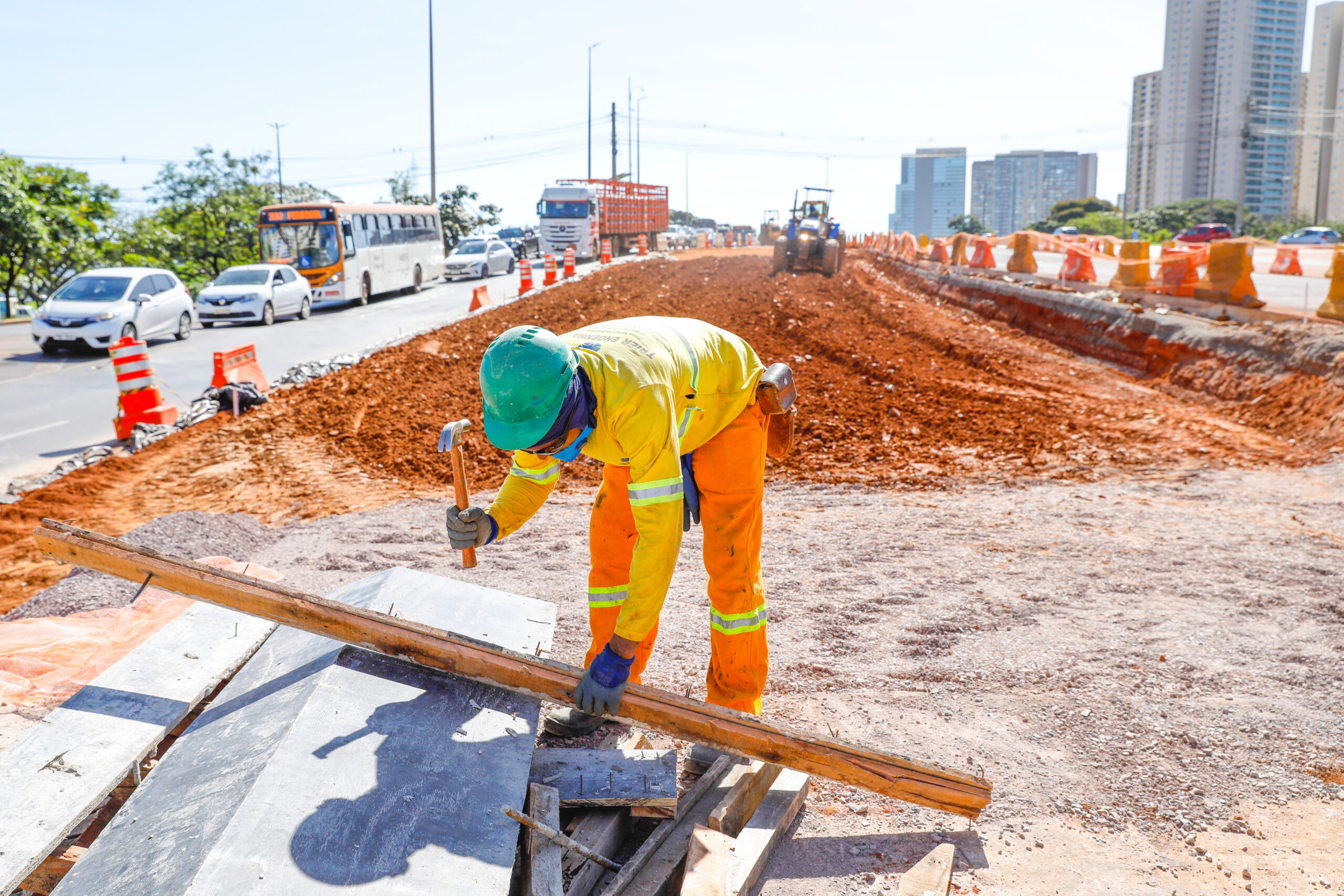 A boa qualidade do acabamento da pista depende muito da capacidade de compactação do terreno. É o que explica o engenheiro civil José Alfredo Aguiar, um dos responsáveis pela obra do Túnel de Taguatinga. “Precisamos que o solo atinja a umidade ideal para que seja 100% compactado”, conta. “Se a terra está muito seca, é preciso molhar. Se está muito úmida, precisamos ‘abrir’ o solo para que possa secar”.