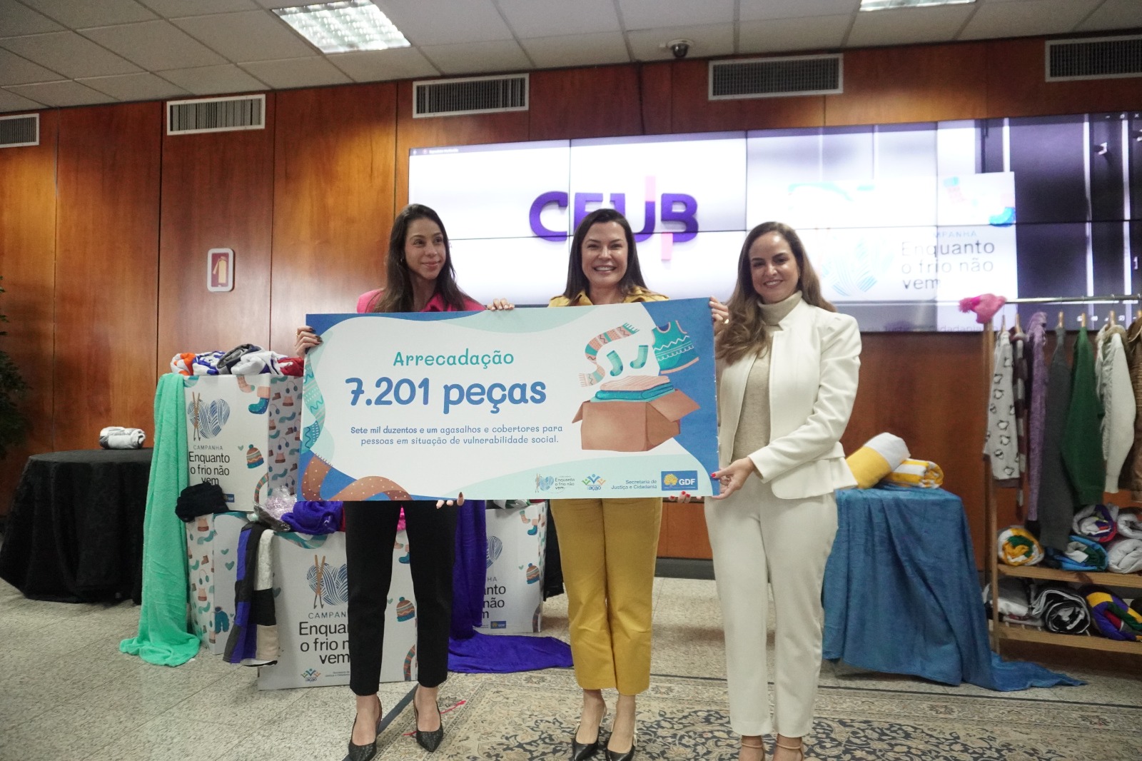 O Salão Nobre do Palácio do Buriti ficou lotado na tarde desta quinta-feira (27) no evento de encerramento da campanha Enquanto o Frio não Vem, da Secretaria de Justiça e Cidadania do Distrito Federal (Sejus). Empresários parceiros da campanha e convidados estiveram presentes para a prestação de conta da iniciativa que arrecadou, ao todo, 7.201 peças, entre agasalhos, cobertores e demais itens de vestuário que irão amenizar o frio de pessoas em situação de vulnerabilidade social.
